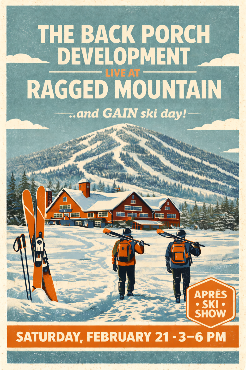 The Back Porch Development is playing an après ski show at Ragged Mountain Saturday February 21 from 3–6 PM — and two of our long-time members, Adam and Kyle, are in the band!