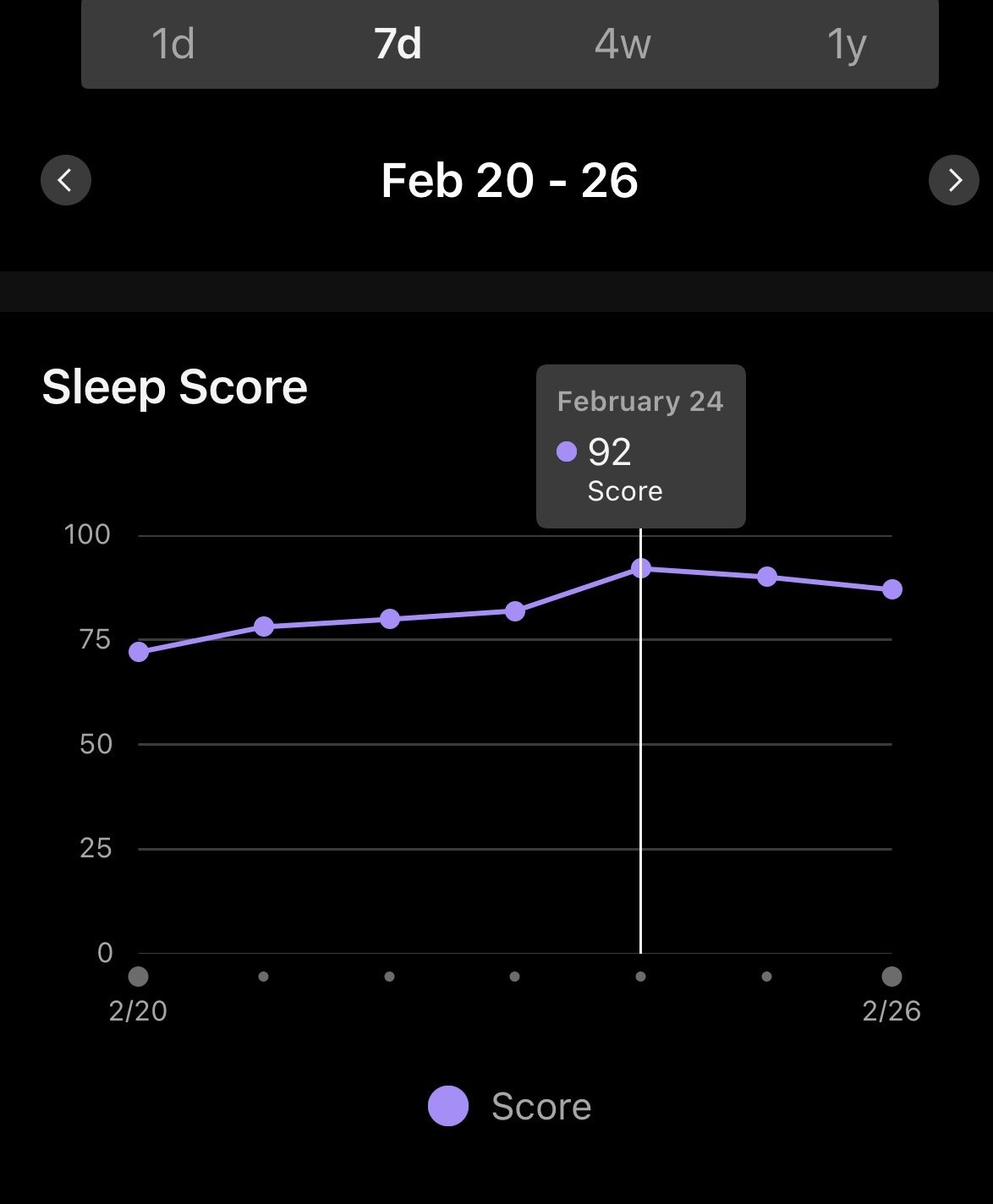 My sleep score is climbing! I had a great week of sleep on vacation, with averages higher than normal. I’m trying to carrying that sleeping energy into this week, and so far, so good.