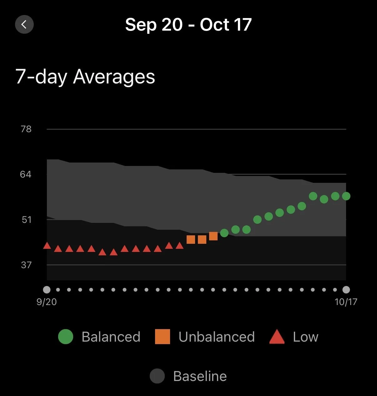 I’m happy to report my HRV has been trending in the right direction. As it gets settled within the baseline, my resting heart rate has finally dropped into its normal range too. This was a long ordeal. So long you can see my baseline even shifted down slightly.