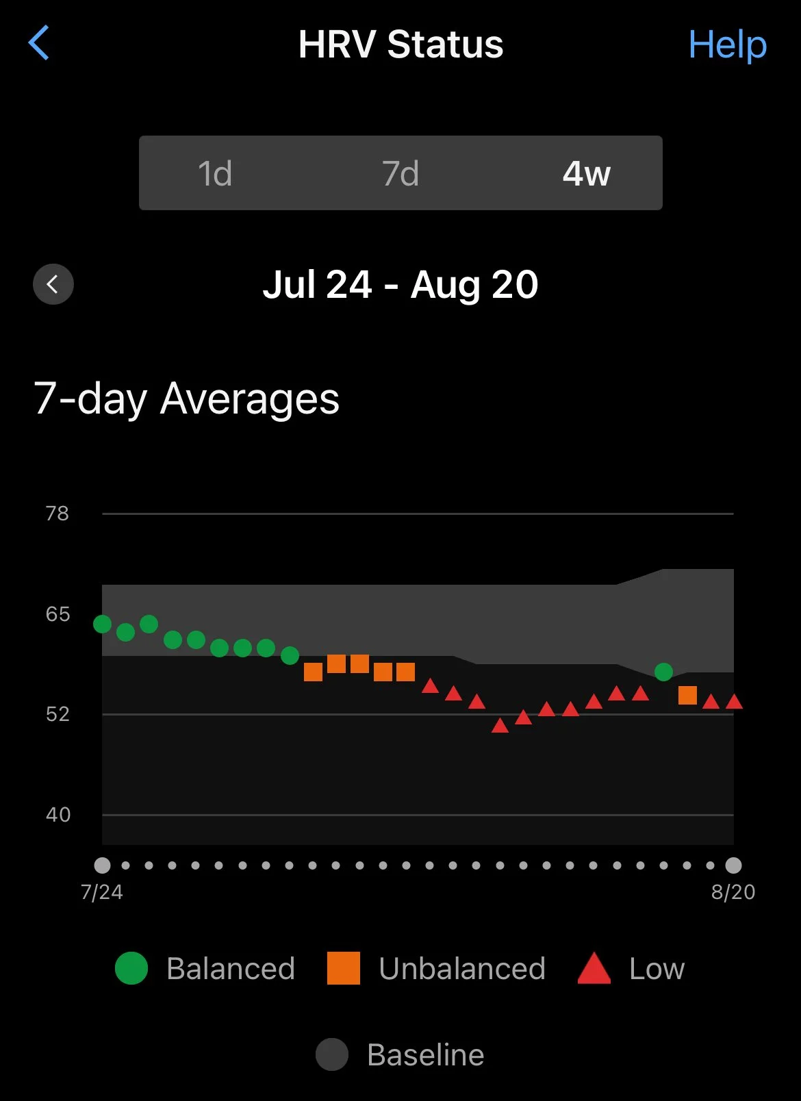 In August, though, the dip started during race week. And honestly? I ignored it. My training load was already reduced, and I was doing the run no matter what. That’s the reality—training is stress, and big events magnify it. Sometimes your numbers will take a hit no matter what.