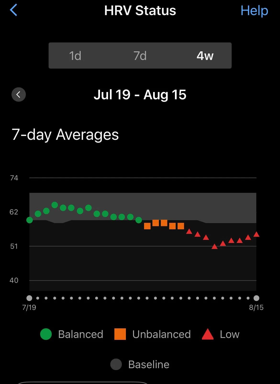 Here’s my HRV chart from the past four weeks. That lowest dip in red? Morning of the MMD 50k.